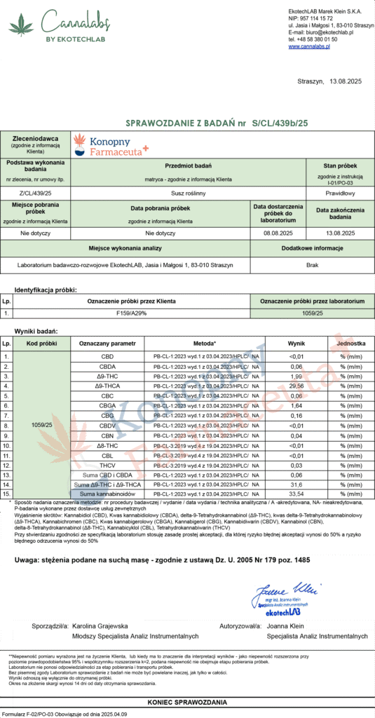 Odmiana zapewnia silny efekt cielesny, uspokojenie i rozluźnienie – polecana przede wszystkim do stosowania wieczorem. Działa kojąco na napięcie, sprzyja wyciszeniu i ułatwia zaśnięcie. Sourdough to wybór dla osób, które szukają intensywnego działania oraz aromatu z goryczą, przyprawowością i ciężarem typowym dla najmocniejszych przedstawicieli rodziny indica.