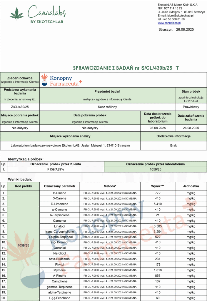 Profil zapachowy Sourdough to mieszanka pikantnych nut, aromatu zakwasu chlebowego i wyraźnej benzynowości. Kompozycja jest ostra, złożona, lekko drażniąca – przeznaczona dla użytkowników ceniących charakterne, „ciężkie” szczepy. Wśród głównych terpenów wyróżniają się limonen, kariofilen, mircen, linalol i bisabolol, które odpowiadają zarówno za aromat, jak i działanie fizyczne.