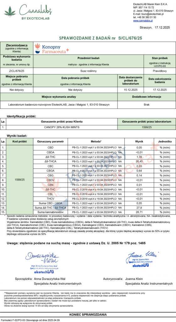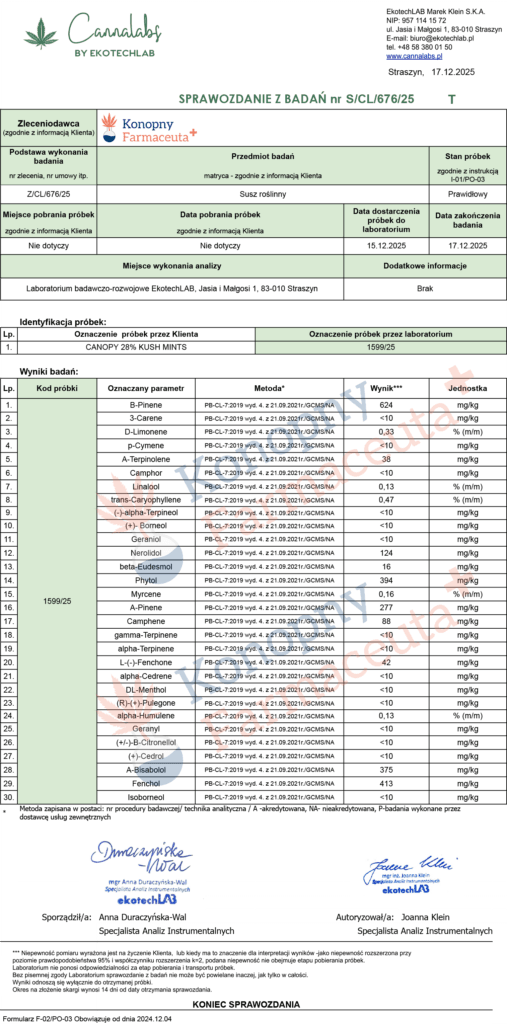 Kush Mints to nowość od długo nieobecnego na rynku producenta Canopy Growth. Jest to odmiana o wysokim stężeniu THC (28%), powstała ze skrzyżowania Animal Mints i Bubba Kush (klasycznej, ciężkiej indici). Już sama nazwa przyciągnęła moją uwagę, ponieważ mam słabość do świeżych profili terpenowych – zarówno cytrusowych, jak i miętowych – a do genetyki Kush czuję spory sentyment. W tym przypadku nazwa kultywaru okazała się bardzo trafna.