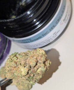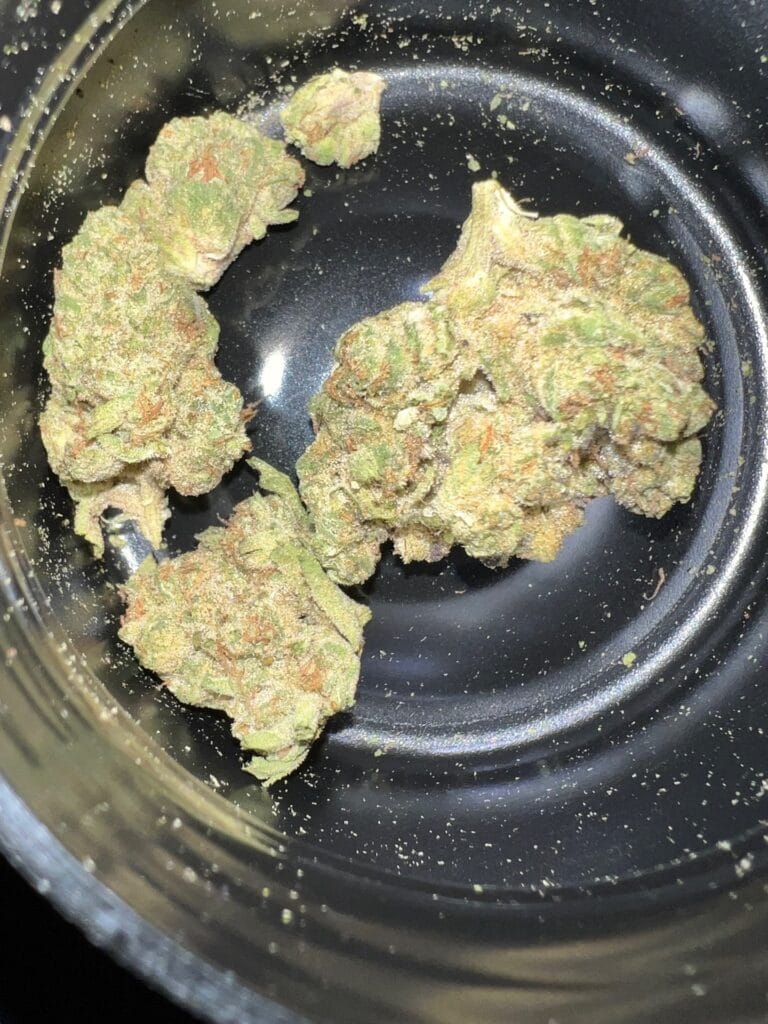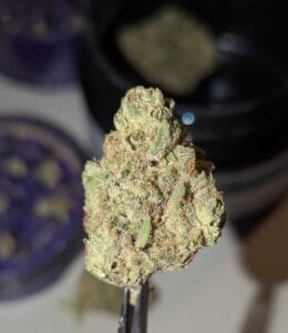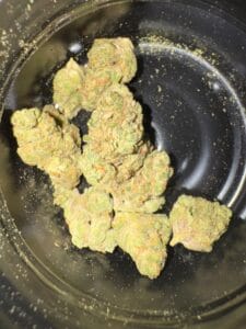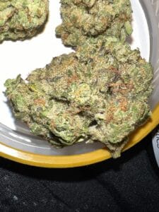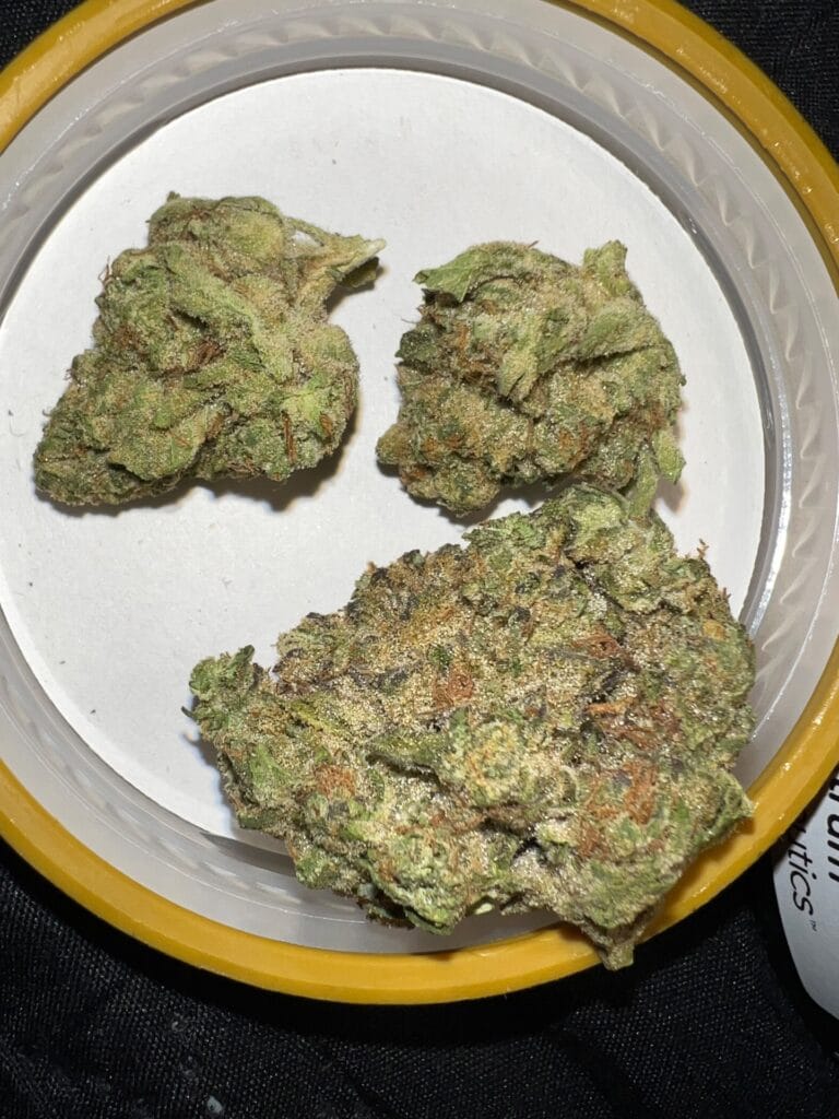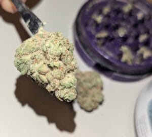 Po otwarciu 5-gramowego opakowania zapach początkowo nie był zbyt intensywny. Dopiero po bliższej inspekcji wyczuwalna stała się słodka, ciasteczkowa mięta, przełamana leśno-iglastym powiewem. W tle wyraźnie zaznacza się również ciężki, charakterystyczny dla Kushy aromat. W środku znalazłem cztery duże topy (w tym jeden o wadze aż 2,4 g). Kwiatostany są mocno zbite, co jest typowe dla tej genetyki.